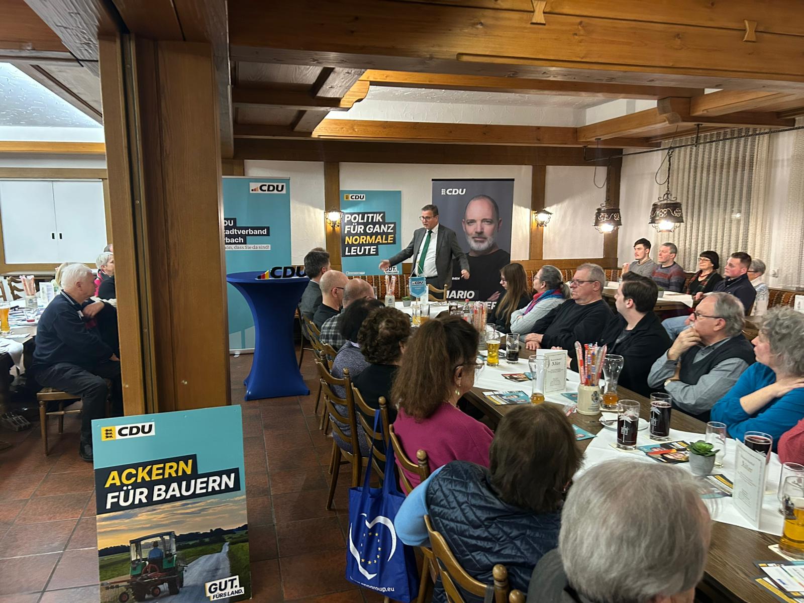Erbach. Auf Einladung von Landtagskandidat Mario Schneider kam der Minister für Ländlichen Raum, Ernährung und Verbraucherschutz, Peter Hauk nach Erbach-Dellmensingen in den Brauerei-Gasthof Adler. Vor etwa 70 interessierten Besuchern gab Hauk einen breiten Einblick in die Themen seines Ministeriums.